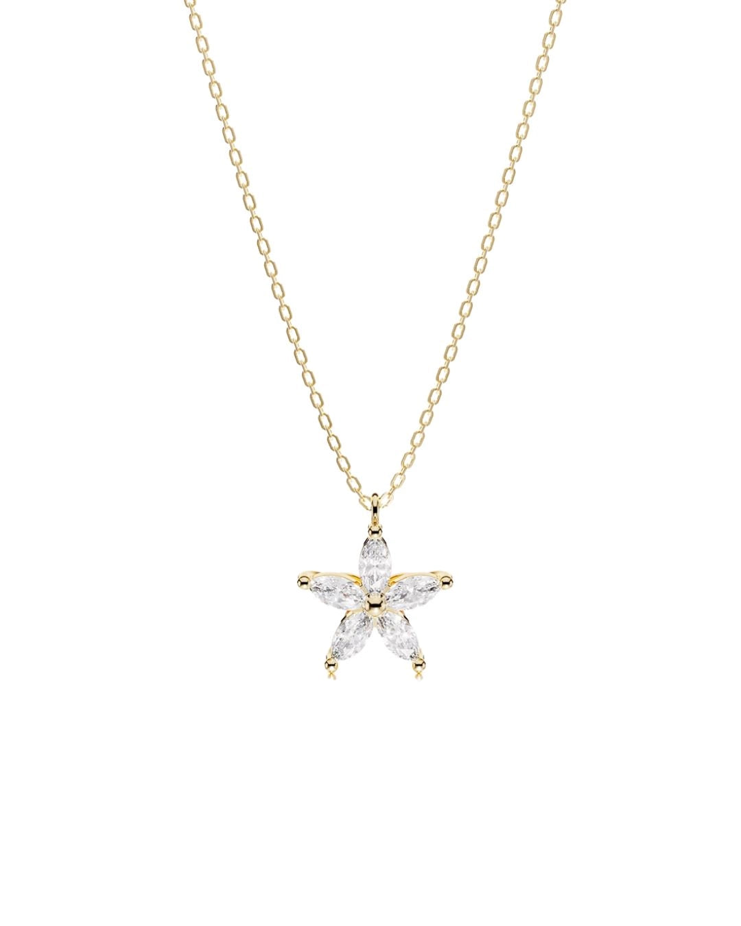 Embrace the magic of spring with the Flower Pendant, a charming part of our Flower Collection. This necklace is adorned with an enchanting flower with five leaves, each leaf sparkling with beautiful stones. Perfect for wearing alone or in combination with other jewelry from the same collection for a complete look. Let your style flourish with this timeless craftsmanship.