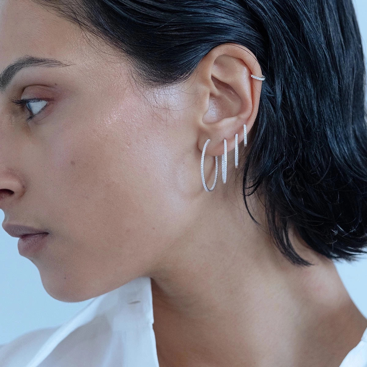 A set with our popular thin and delicate Stone Hoops earrings. Includes three sizes – 15 mm, 20 mm, and 25 mm – to give you the ability to create your own unique look. Choose between gold or silver with white crystals.